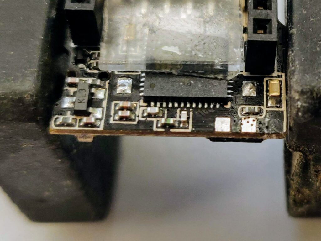 Flipping over the PCB shows the 3D antenna connected to a capacitor-inductor network and the LNA pin on the ESP32-Pico chip.