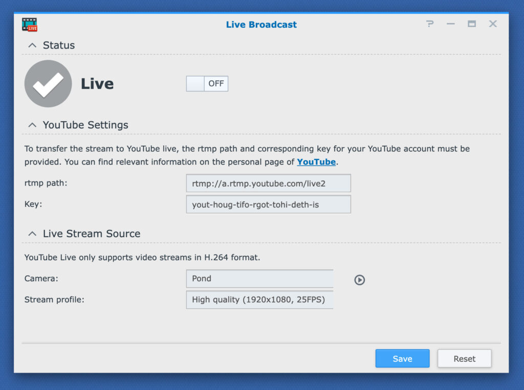 I then found the built-in Synology solution to publish to Youtube – Live Broadcast. You enter the RTMP path from Youtube and your stream key, then choose the camera and quality to send. Done and dusted….?