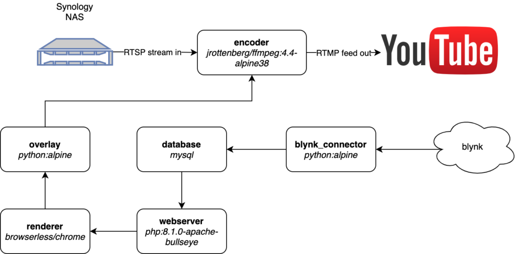 My goals were to get the stream to Youtube with auto-restart, but that quickly changed to wanting to add overlays and other silliness. Here is the overview: