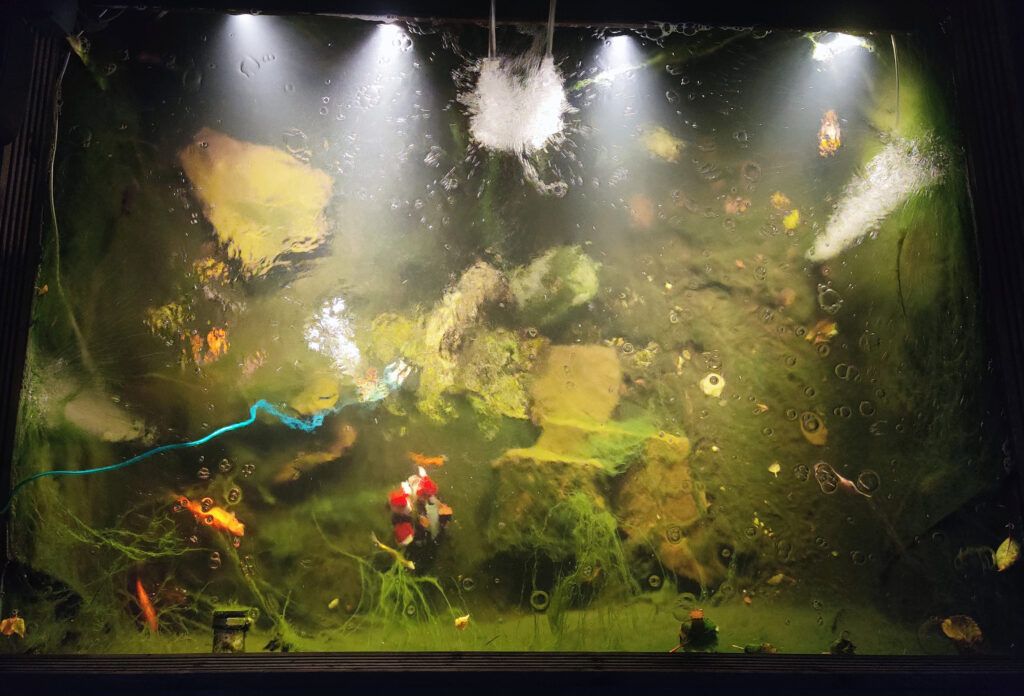 Thinking the water was bad, I scooped out the still wiggling fish into a dechlorinated inflatable pool and hoped that I could triage the survivors. The air stones arrived, and the pond soon looked like a jacuzzi as I tried to raise the oxygen level. The water was crystal clear with the fresh filter/UV bulb and the temperature was good. Clear water doesn’t mean that there isn’t a problem however, and I had no way of knowing without a testing kit.