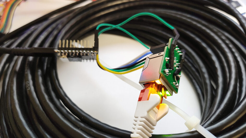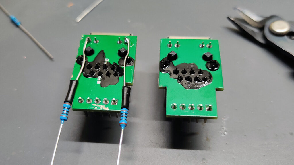 Two RJ45 breakout boards with heatshrink and nail polish added for resistors.